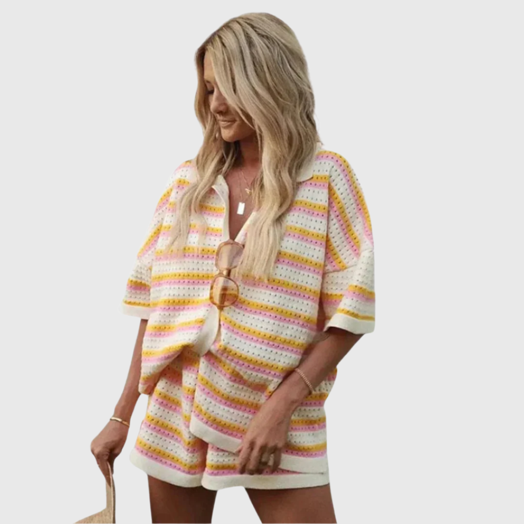 The Yara set is your easy go-to for warm days when you want to look polished yet feel completely at ease. Its breezy, open-knit texture keeps you cool while the gently relaxed fit flatters your shape without clinging. The classic button-down top pairs perfectly with the matching shorts for a laid-back, modern look — ideal for slow weekends, sunny getaways, or just feeling stylish at home.